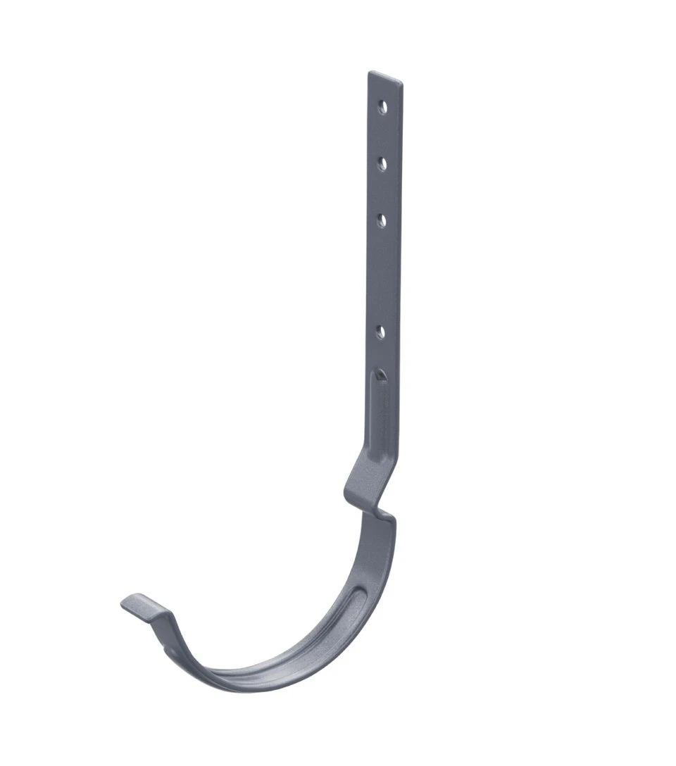 Выполнен из оцинкованной стали с полиуретановым покрытием. Облегчает монтаж водосточной системы за счет расположения фиксатора с внешней стороны крюка, что позволяет устанавливать желоб и после монтажа кровельного материала.